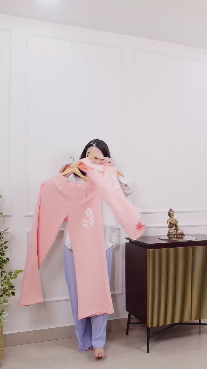 A celebration of softness and summer ease — this pastel pink co-ord set is crafted from premium banana-crepe and elevated with delicate hand-painted floral motifs. The sleeveless top features a flattering scalloped hem and neckline, fabric-covered buttons, and gentle curves that enhance its feminine charm. Paired with wide-leg pants, each piece is thoughtfully detailed with ivory blooms, painted by hand to evoke a sense of artistry and slow fashion.