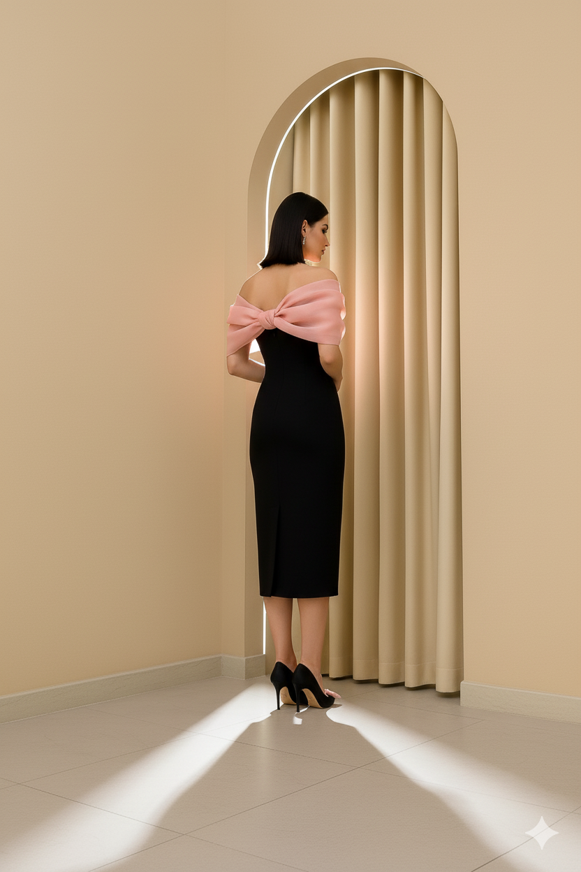 Step into the spotlight with Runway Rosé Noir, a striking off-shoulder midi dress that fuses sleek black nylon-lycra with a soft blush-pink organza bow. The sculpted silhouette flatters every curve, while the airy bow drapes like a couture flourish—perfect for cocktails, galas, or any evening where effortless drama steals the room.